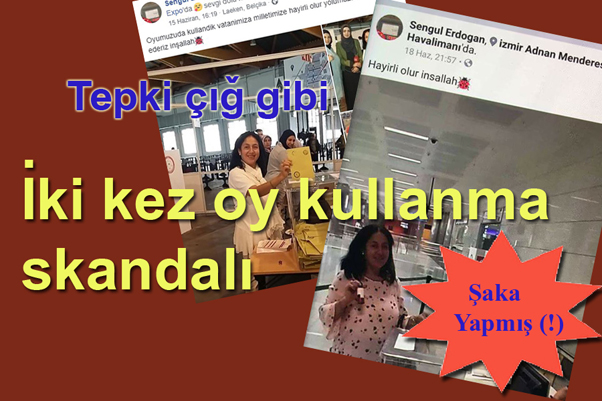 Önce Belçika, Brüksel’de oy kullanıp fotoğraf çektiren, sonrasında İzmir Havaalanında oy kullanan, bunları da toplumsal paylaşım ortamı Facebook’ta yayınlayan AKP’li Şengül Erdoğan, gelen yoğun tepkiler üzerine bunun bir şaka olduğunu, kendisinin sadece İzmir sınır kapısında oy kullandığını savladı.