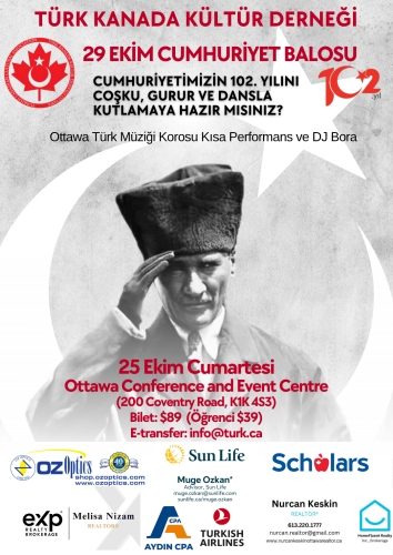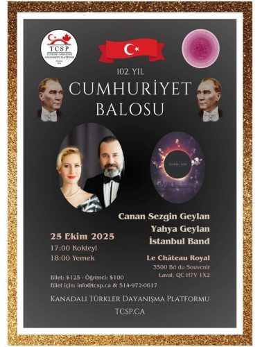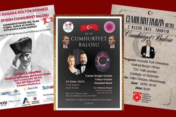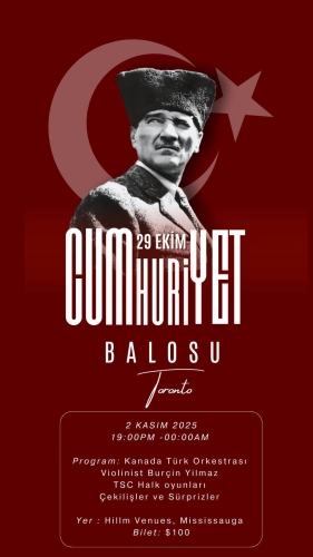 Toronto’da etkinlik gösteren Türk Kanada Kültür ve Folklor Derneği ise Cumhuriyet kutlamasını 2 Kasım’da düzenleyecek. Mississauga’da düzenlenecek Cumhuriyet Balosu’na ilişkin ayrıntılar şöyle: