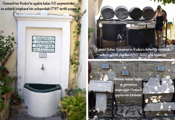 Kütüphane avlusunda, Osmanlı’nın Rodos’ta ayakta kalan 55 çeşmesi arasında en eski örneklerden biri kabul edilen 1797 tarihli çeşme, Kanuni Sultan Süleyman’ın Rodos’u fethettiği dönemde askerlere yemek pişirildiği belirtilen 650-700 yıllık büyük kazanlar, mermer mezar taşları ve günümüze ulaşamayan Osmanlı yapılarından geriye kalan kitabeler, Rodos’taki Osmanlı mirasının farklı parçalarını aynı alanda buluşturuyor.